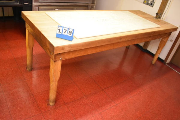 Butcher block top table with can opener, table is approx. 96" long x 34" wide, also includes cutting board that is approx. 65" long