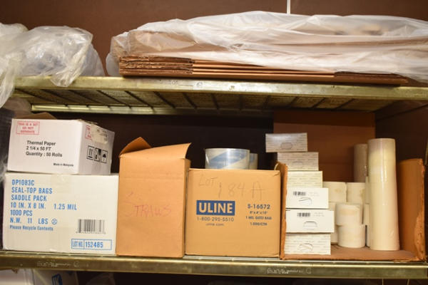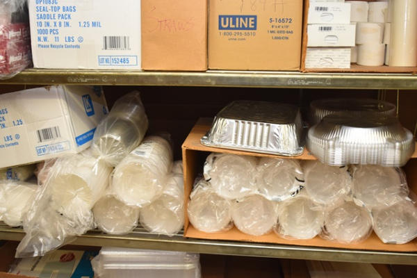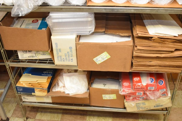 Shelving unit contents consisting of to-go containers, bag tie wraps, brown bags, pastry bags, etc.