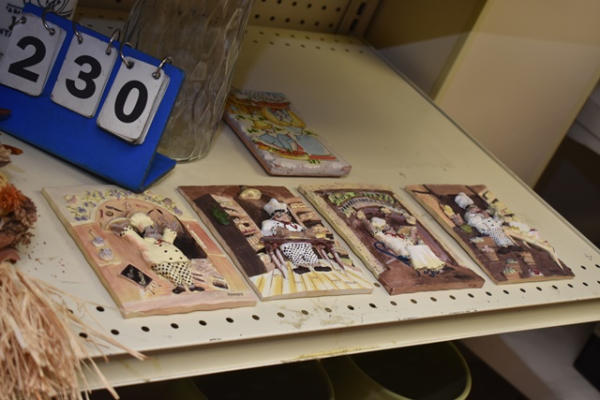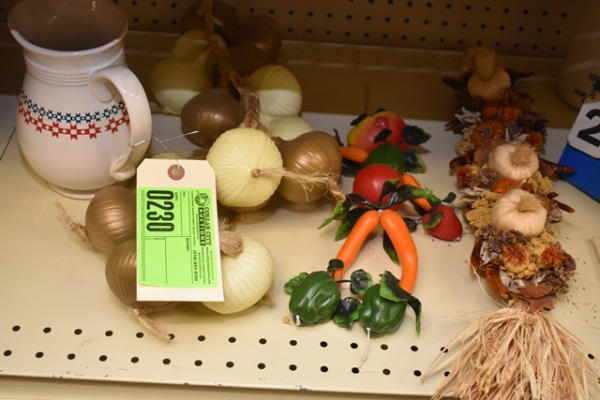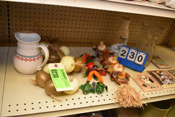 Shelf lot of décor items including plastic garlic, milk jug, etc.