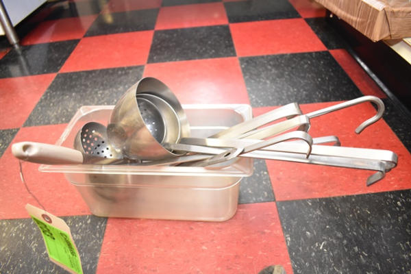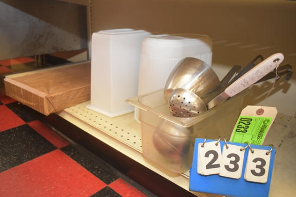 Shelf lot of contents including ladles, small trash cans