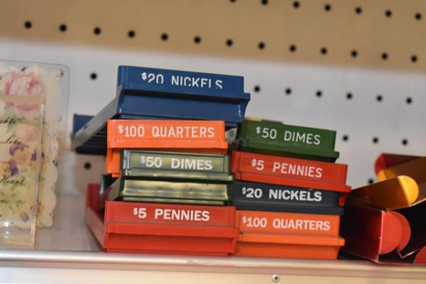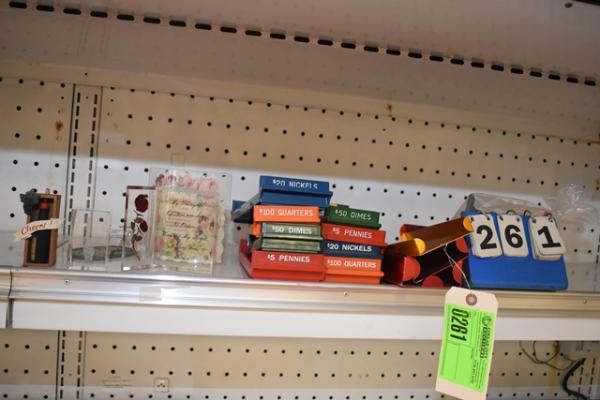 Shelf lot of items including coin counters, coin trays, glass knick knacks