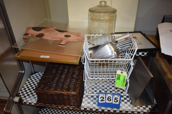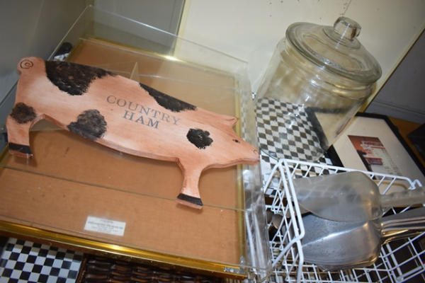 Shelving unit contents consisting of scoopers, cookie jar, country ham pig, wicker basket, etc.