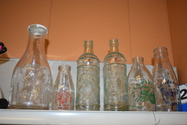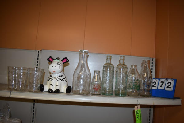 Shelf contents consisting of milk bottles, milk glasses and ceramic cow