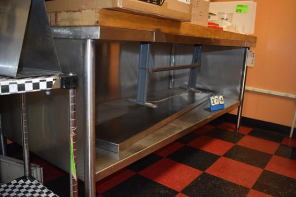 Butcher block top, stainless steel table, approx. 72" long x 33 1/2" deep