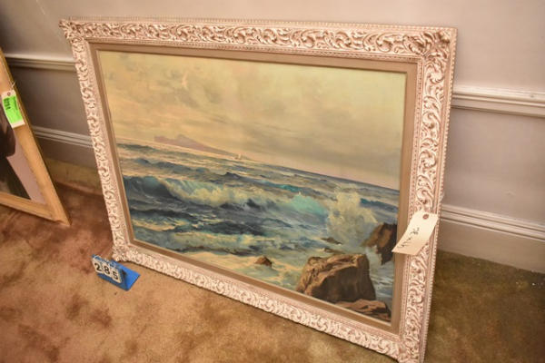 Framed painting on canvas, water scene, approx. 47" x 36"