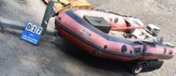 Achilles rubber raft, approx. 5' wide x 13' long, with Evinrude 15 hp gas engine, on single axle boat trailer, no transferable paperwork