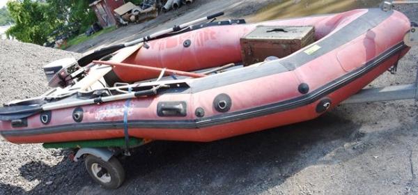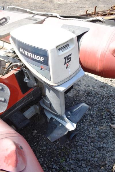Achilles rubber raft, approx. 5' wide x 13' long, with Evinrude 15 hp gas engine, on single axle boat trailer, no transferable paperwork