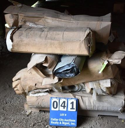 Pallet of plastic and roofing material, plastic appears to be 20' x 100' rolls, some of 6 mil