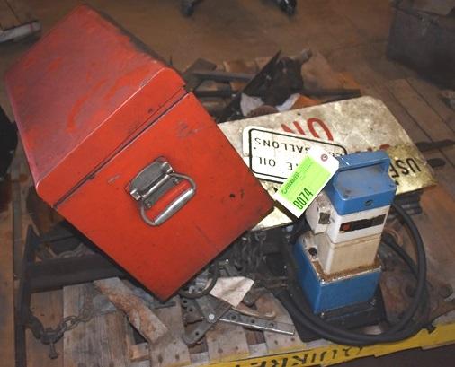 Pallet lot of tools including toolbox, large wrenches, pullers, etc.