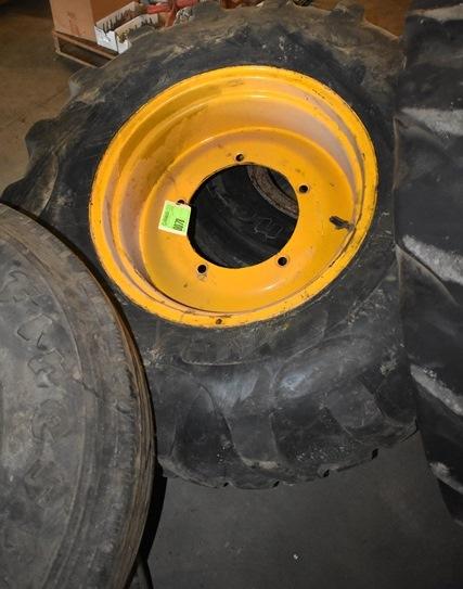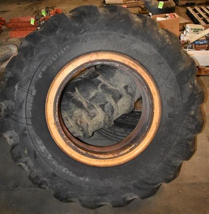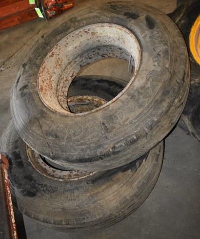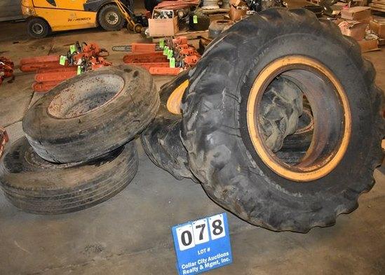Lot of assorted tractor tires and over-the-road tires, assorted sizes. Equipment tires are 14-24TG with open center, 5 lug rim is 16-924. Truck rims and tires including 11R22.5