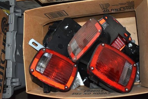 Pallet lot consisting of tail lights, fire extinguisher basket, parts, etc.