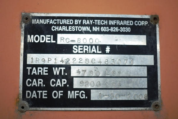 Raytec Infrared Corp 4-wheeled propane powered hot box, Model RC-8000, VIN: 1R9P142228C463071, tear weight is 4,780 lbs., carrying capacity is 9,200 lbs. Date of Manufacturing: 2008, no propane tanks included, does not include propane tanks shown in photos