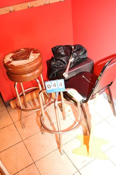 Lot consisting of assorted stools in need of repair, chair, ottoman, wet floor sign