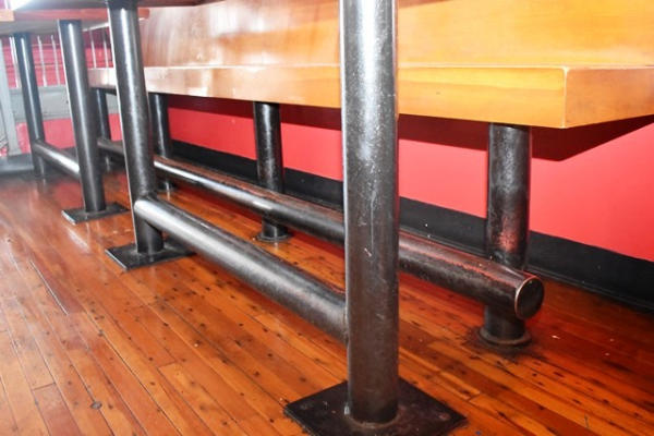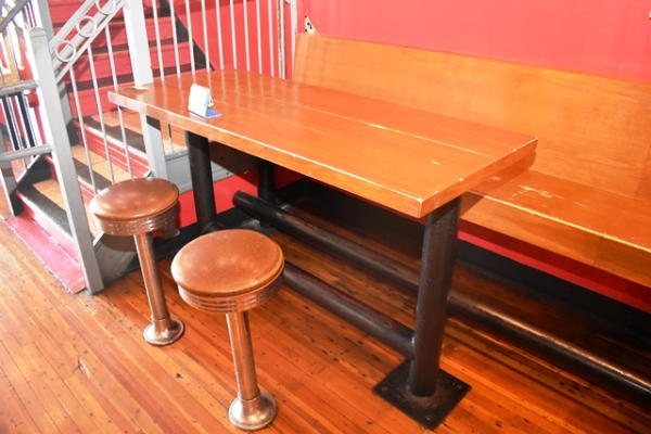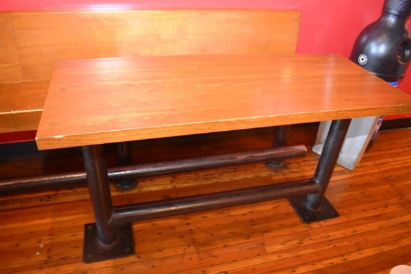 Lot of 2 30" x 72" tables, approx. 14' long bench, 2 stools, all bolted to the floor (CUSTOMER MUST REMOVE)