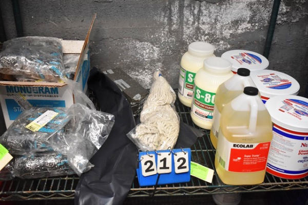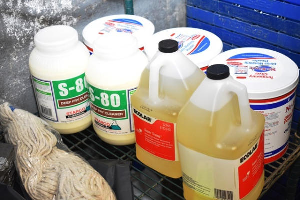 Shelf lot of cleaning supplies
