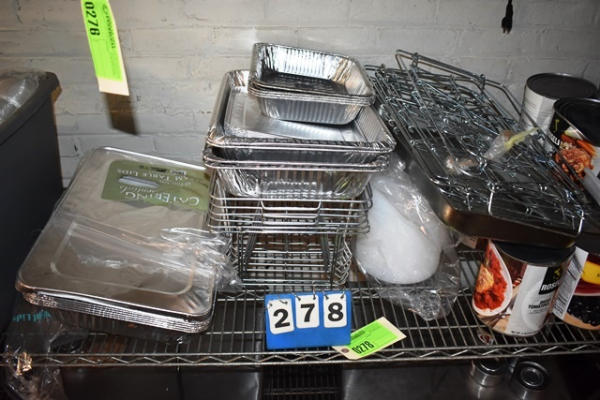 Shelf lot consisting of chafing dishes, chafing dish holders, etc.