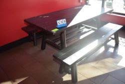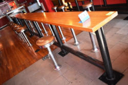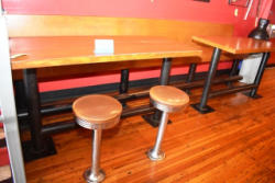 Lot of 2 30" x 72" tables, approx. 14' long bench, 2 stools, all bolted to the floor (CUSTOMER MUST REMOVE)