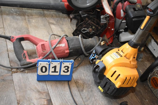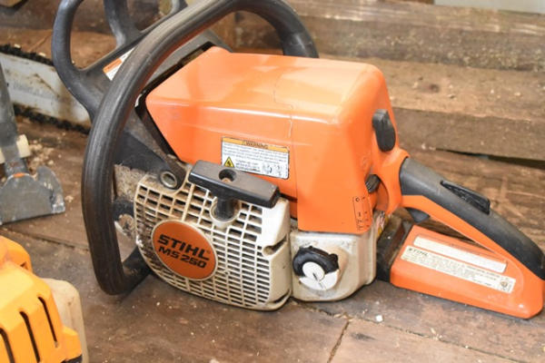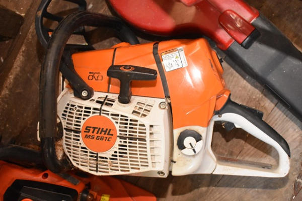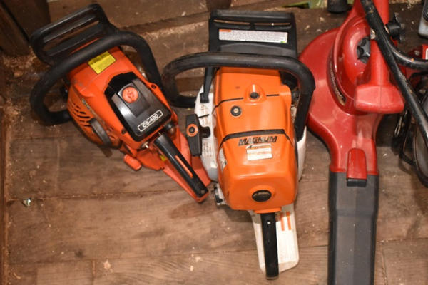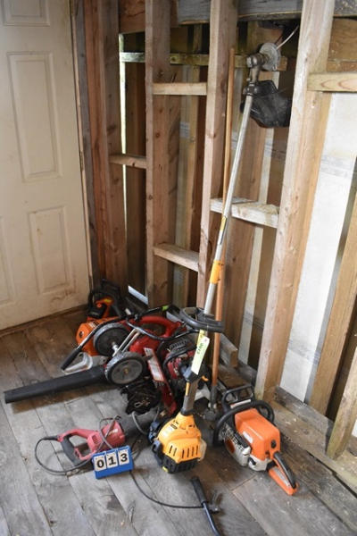 Lot consisting of assorted chainsaws including Stihl, most appear to be missing bars, weed wacker, electric leaf blower, etc.