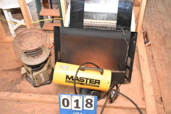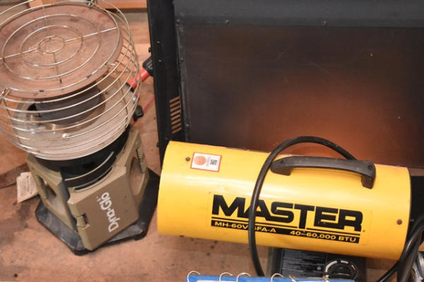 Lot of heaters including a Master 40000 BTU propane salamander, Dyna Glow Heater and 2 wall mount heaters