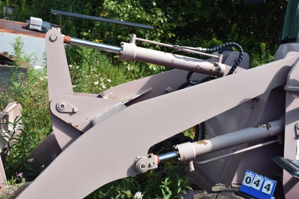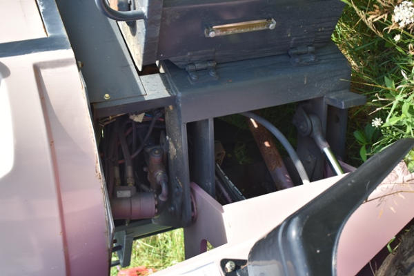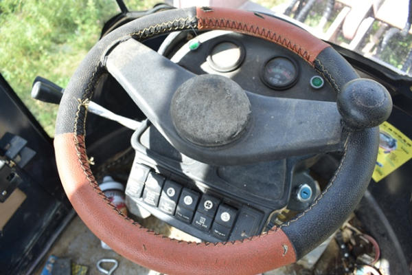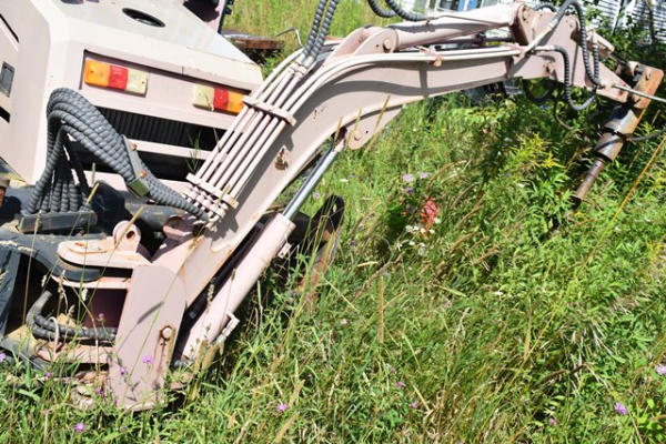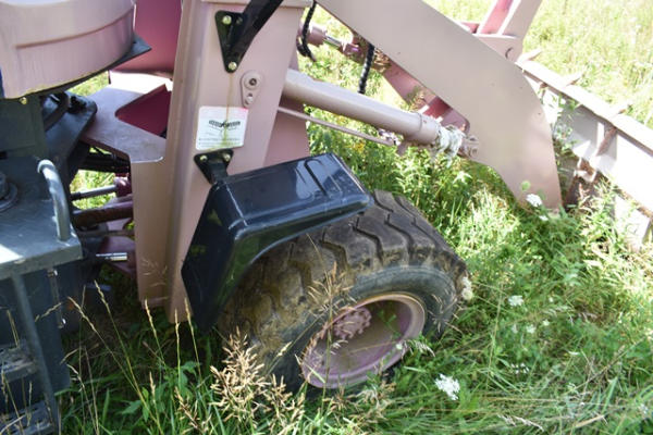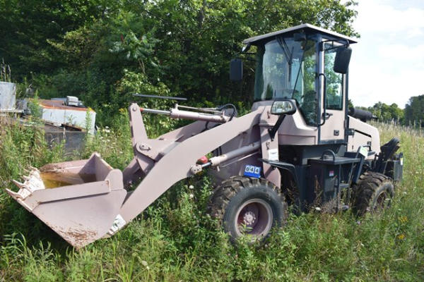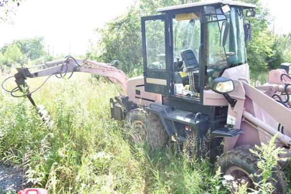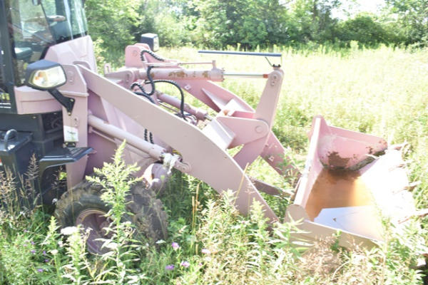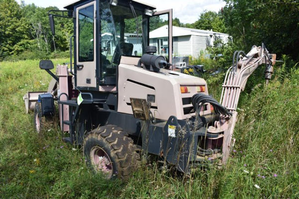 Rubber tired small loader with backhoe attachment, also includes bucket and post hole digger, 4 cylinder diesel, missing battery, was told that it was running when parked, also has 1 flat tire