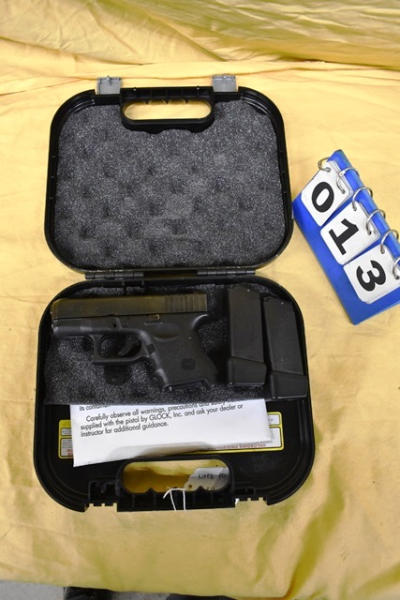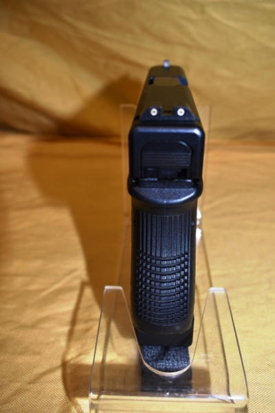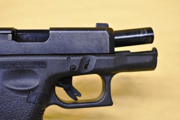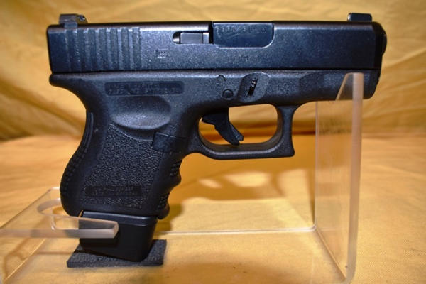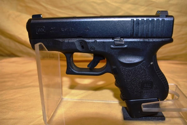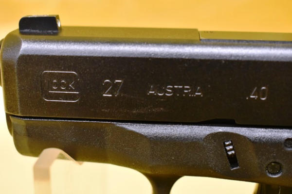 Glock 27 .40 Caliber semi-automatic handgun. 3" Barrel. SN: GGR849. Comes with 1 spare magazine and transport case. Both included magazines have Glock "2 plus 2 9mm/.40 S&W" magazine extension