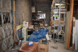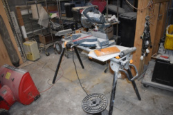 First Floor Corner Lot, Shelving Contents Consisting of DeWalt Vacuum, Makita Electric Chainsaw, Paint, All-Purpose Joint Compound, Extension Cord, Ladder, Mop Bucket, Bosch Miter Saw on Stand, Roll Around Metro Racks, Garbage Cans, Table Saw, Spreader, Aluminum Step, DOES NOT Include Anything Attached to the Walls