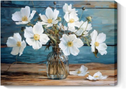 #93 - Mid-Century White Floral Blue Art Painting Vintage Flower Blossom in Vase Canvas Wall Art for Bathroom Bedroom Living Room Kitchen Office Decor 16x12inches