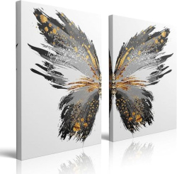 #99 - 2 PCS Framed Black And Gold Butterfly Wings Canvas Wall Art Modern Aesthetic Vogue Decor Poster For Living Room Bathroom Home Office Artwork Gift Ready To Hang (16"x24"x2PCS)