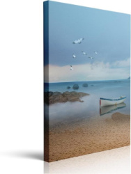#100 - Framed Blue Beach Ocean Seagull In The Sky Canvas Wall Art Boat On The Sea Lake Coastal Nature Decor Poster For Living Room Bathroom Home Office Artwork Gift Ready To Hang (12"x16")